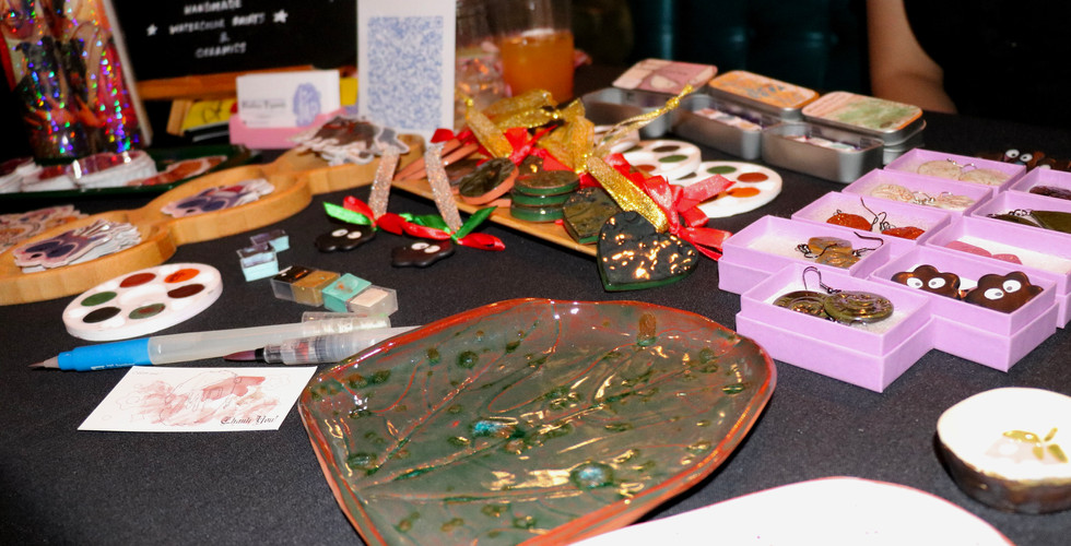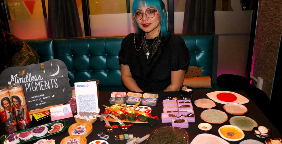 I spoke with the artist who owns Mindless Pigments. She creates handmade watercolor paints with honey. She also makes ceramic paint palettes that you can use to mix watercolor on or decorate a table with as a decorative plate. She has a really cute art style which you can see in her raccoon and croissant stickers.
